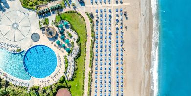 Собствен пясъчно-чакълест плаж. Бар на плажа. Снек ресторант. Чадъри, шезлонги, матраци, плажни кърпи на плажа и при басейна-безплатно.