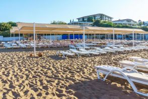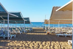 Собствен, на 500 м. от хотела, пясъчен. Безплатен шатъл до плажа (в определен часови диапазон). Чадъри, шезлонги и плажни кърпи на плажа и при басейна – безплатно.